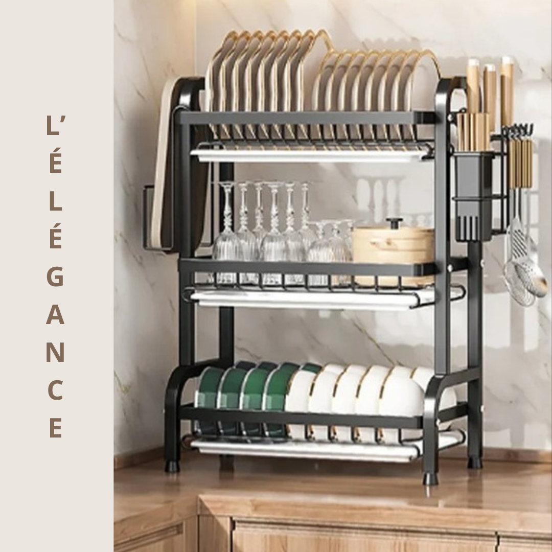 Conçu pour maximiser chaque centimètre carré, il combine robustesse et élégance tout en offrant une solution pratique pour sécher et ranger simultanément. Fini le casse-tête quotidien de la vaisselle mouillée qui traîne partout !